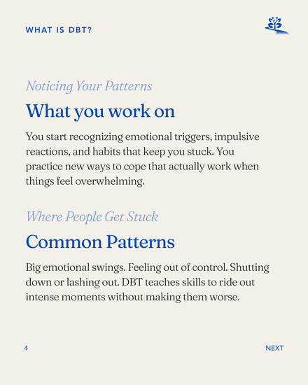 DBT is a structured form of therapy designed to help people who experience emotions intensely. That might show up as mood swings, impulsive decisions, emotional shutdowns, anxiety spikes, or feeling overwhelmed by everyday stress.